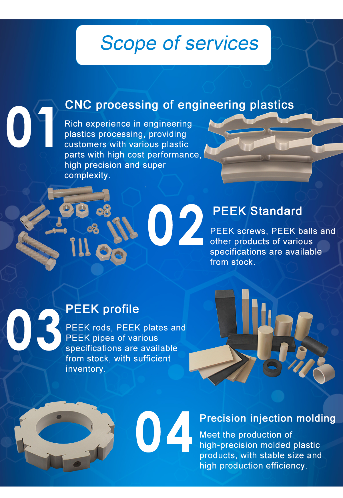 PEEK rod, whose Chinese name is polyetheretherketone rod, is a semi-finished profile extruded from PEEK raw material, which has the characteristics of high temperature resistance, high wear resistance, high tensile strength and good flame retardancy. PEEK rod can be used to process PEEK parts of various specifications, and can manufacture mechanical parts with high requirements, such as gears, bearings, valve seats, sealing rings, pump wear rings, washers, etc. Parts processed with PEEK rods are widely used in key connectors in aerospace, medical, semiconductor, pharmaceutical and food processing industries.